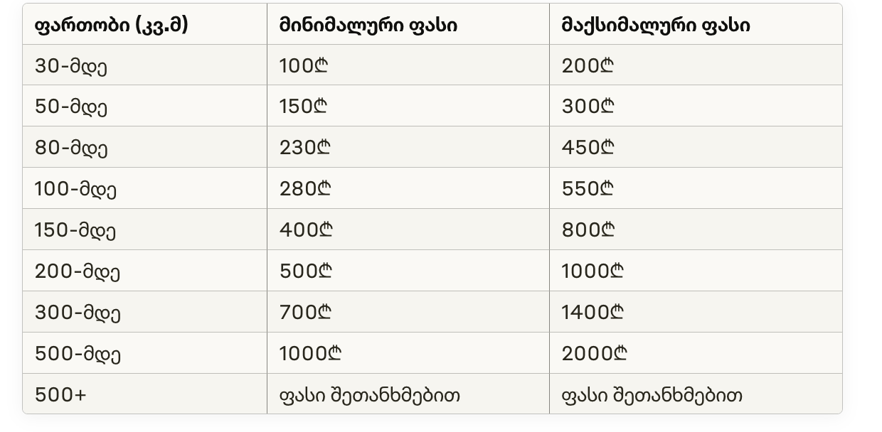 ფასები დამოკიდებულია შემდეგ ფაქტორებზე: